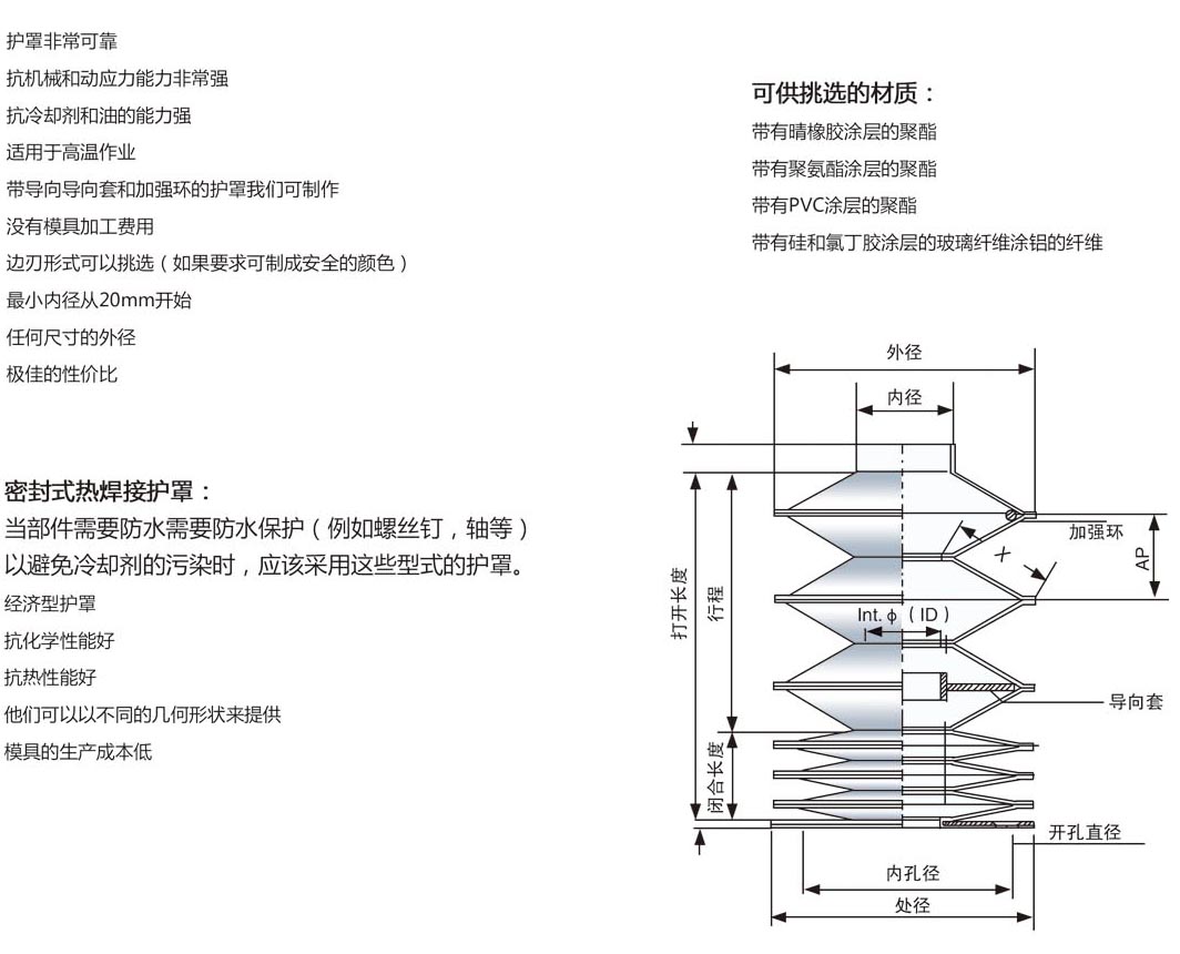 鋼圈支撐的絲杠防護(hù)罩,此種護(hù)罩采用多種面料,內(nèi)有堅(jiān)硬的鋼絲圈支撐、能在高溫110℃、低溫-40℃之間正常工作。可有效的防塵、防水、防油、防乳劑和化學(xué)藥品,外形工整,不易變形,基于它的嚴(yán)密,堅(jiān)挺,此護(hù)罩且可用于眾多機(jī)械的通風(fēng)、除塵等。本產(chǎn)品的靈活不但在材料可選,更在于它可以根據(jù)的具體要求來確定所需直徑和長(zhǎng)度